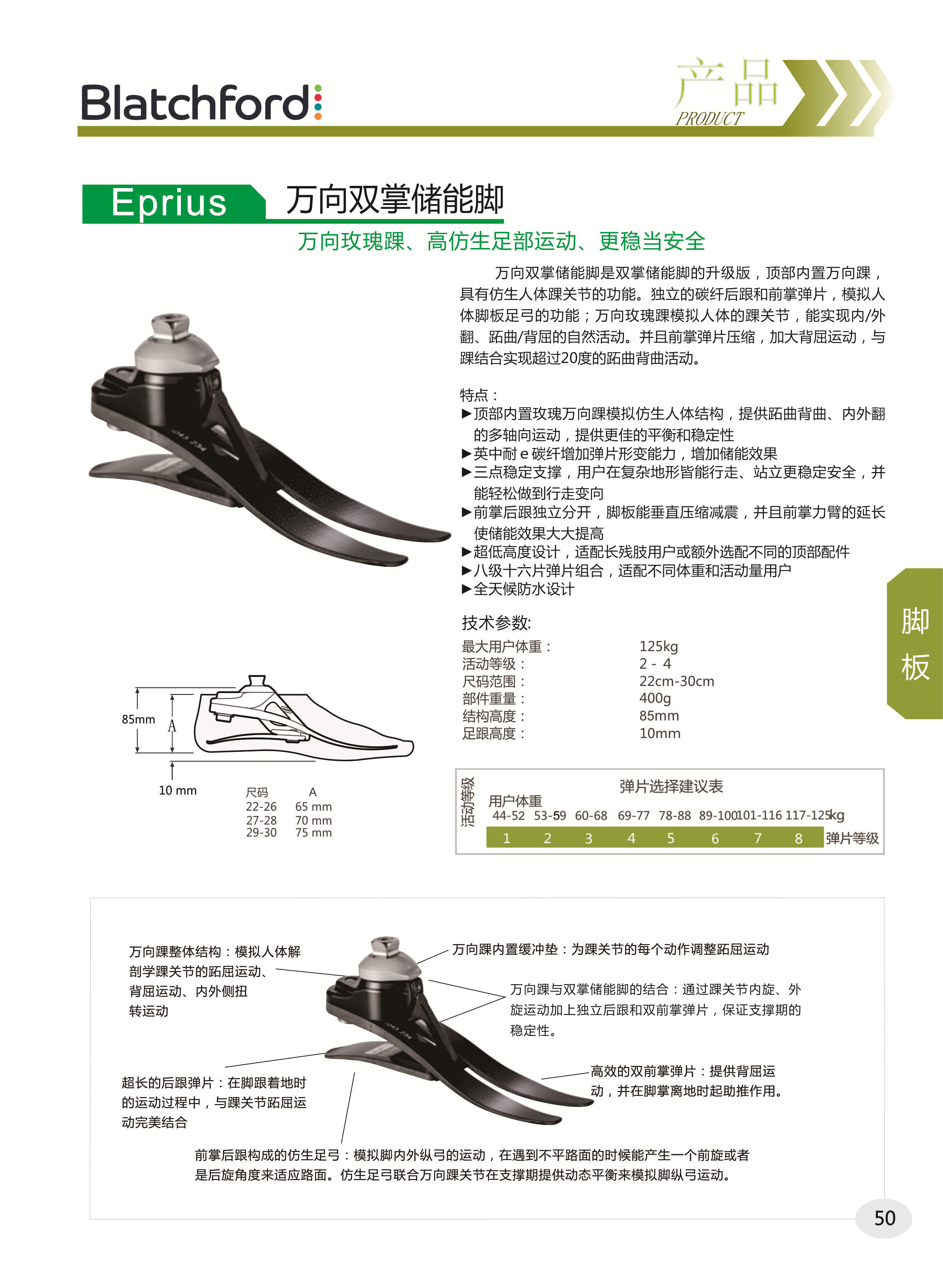 萬向雙掌儲(chǔ)能腳升級版模擬人體腳板的功能;模擬人體的踝關(guān)節(jié),能實(shí)現(xiàn)內(nèi)/外翻、跖曲/背屈、內(nèi)/外旋,三個(gè)自由度活動(dòng)。前掌彈片壓縮,模擬人體的背屈運(yùn)動(dòng)。