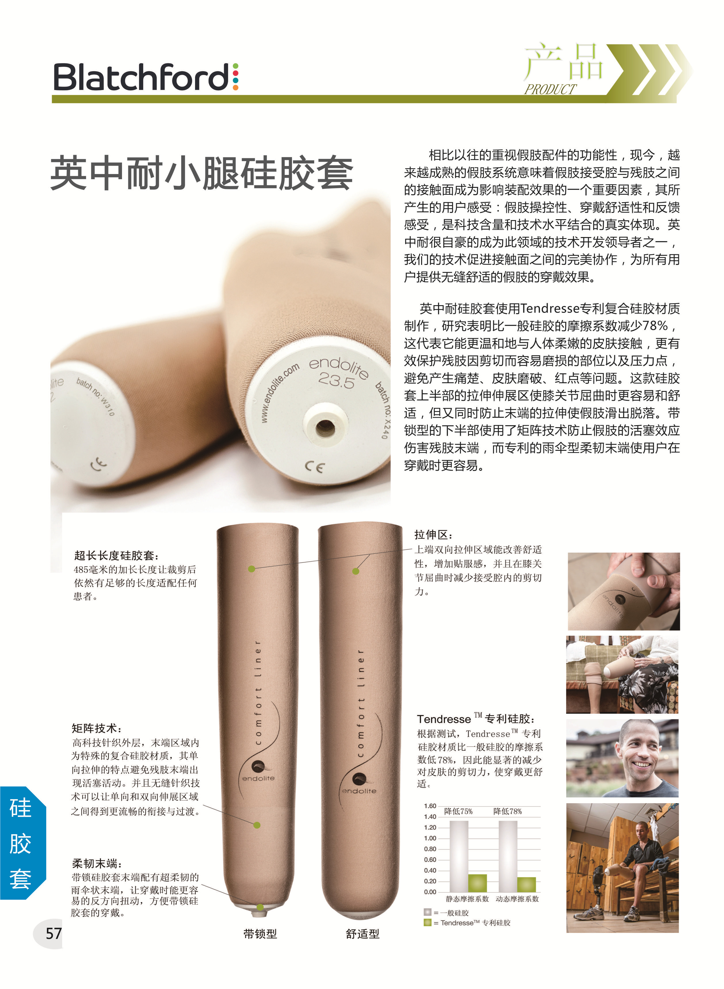 英中耐硅膠套使用Tendresse硅膠作為材質(zhì),研究表明比一般硅膠的摩擦系數(shù)減少78%,這代表它能更溫和地與人體柔嫩的皮膚接觸,能更有效保護殘肢因剪切而容易磨損的部位以及壓力點,避免產(chǎn)生痛楚、皮膚磨破、紅點等問題。這款硅膠套上半部的拉伸伸展區(qū)使膝關節(jié)屈曲時更容易和舒適,但又同時防止末端的拉伸使假肢滑出脫落。帶鎖型的下半部使用了矩陣技術防止假肢的活塞效應傷害殘肢末端,而雨傘型柔韌末端使用戶在穿戴時更容易。