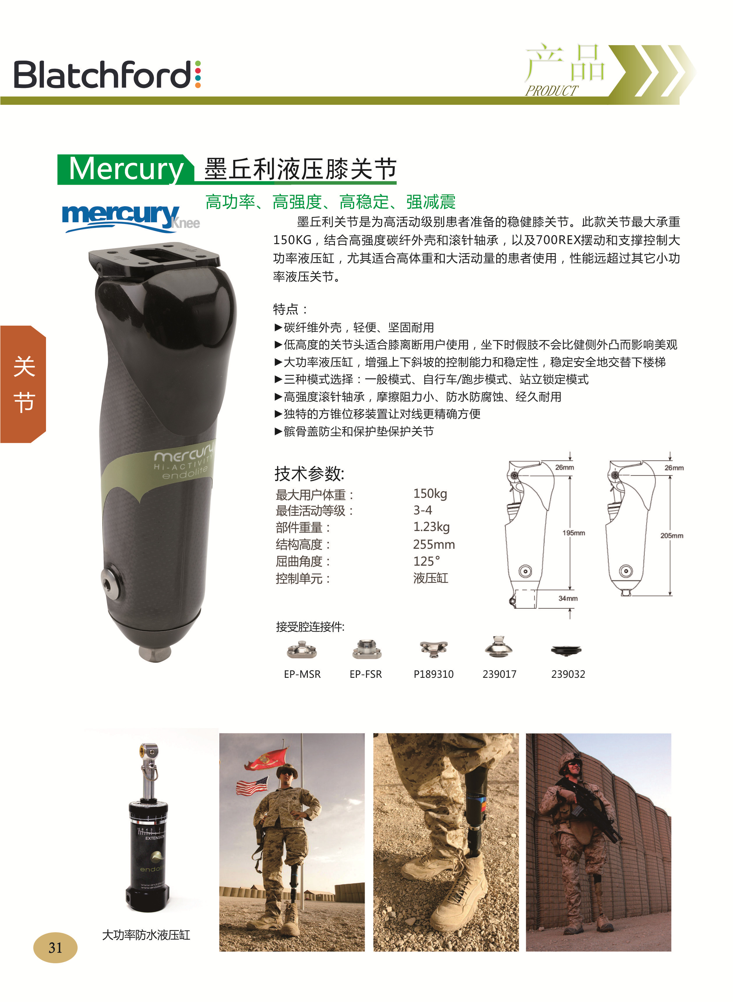 墨丘利關(guān)節(jié)是為高活動級別患者準(zhǔn)備的穩(wěn)健膝關(guān)節(jié)。此款關(guān)節(jié)最大承重145KG,融合碳纖架和滾針軸承,以及700rex擺動和直立期的剎車控制液壓缸。