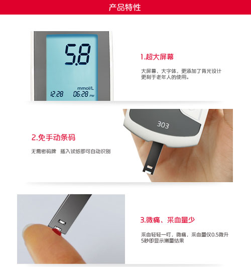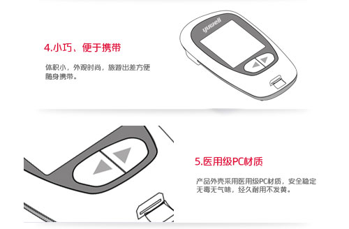 0.5微升采血量,5秒快速檢測,300組記憶值,免條碼,自動退條,血糖管理軟件,數(shù)據(jù)傳輸功能,背光功能